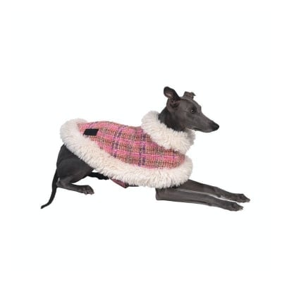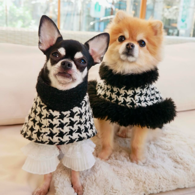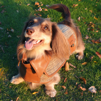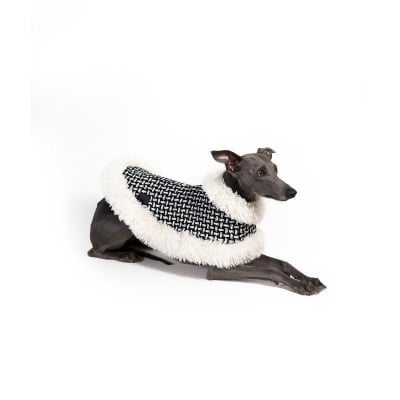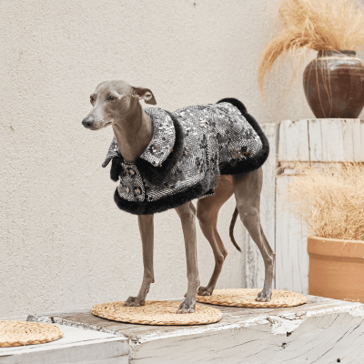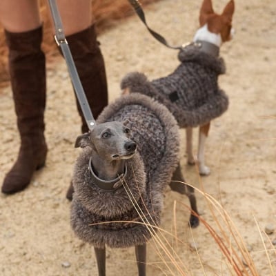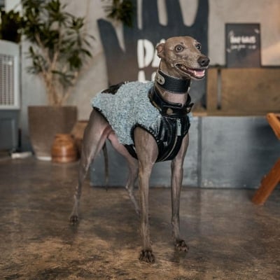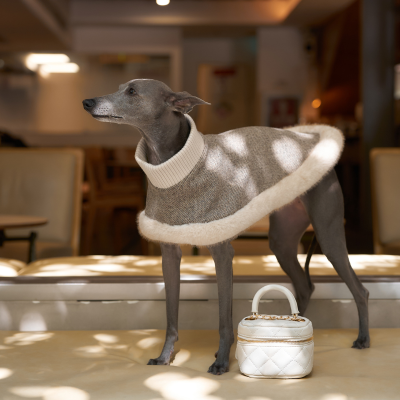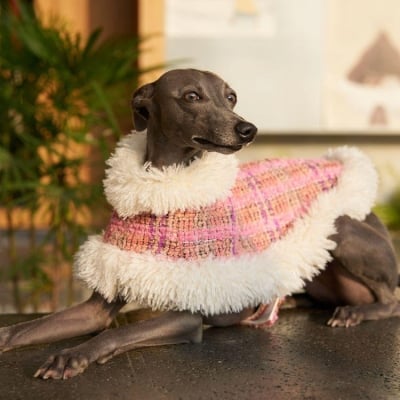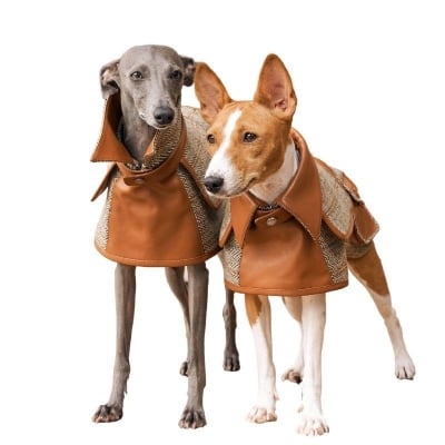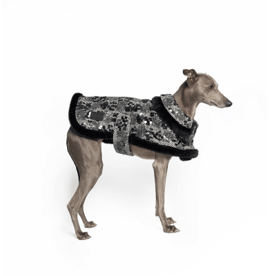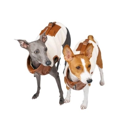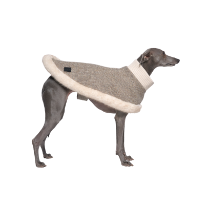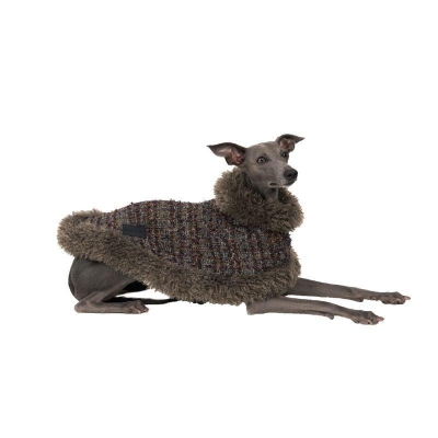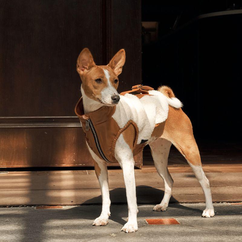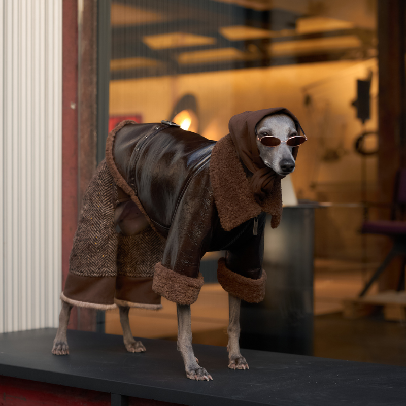 This luxurious brown vegan teddy fur jacket, adorned with chic belt details, provides remarkable warmth and an edgy style that ensures your pet stands out.